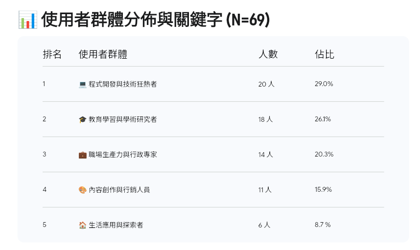 依使用者的「目前用途」與「展望用途」,可歸納出四類需求:程式開發與自動化、知識管理、內容創作、教育輔助。