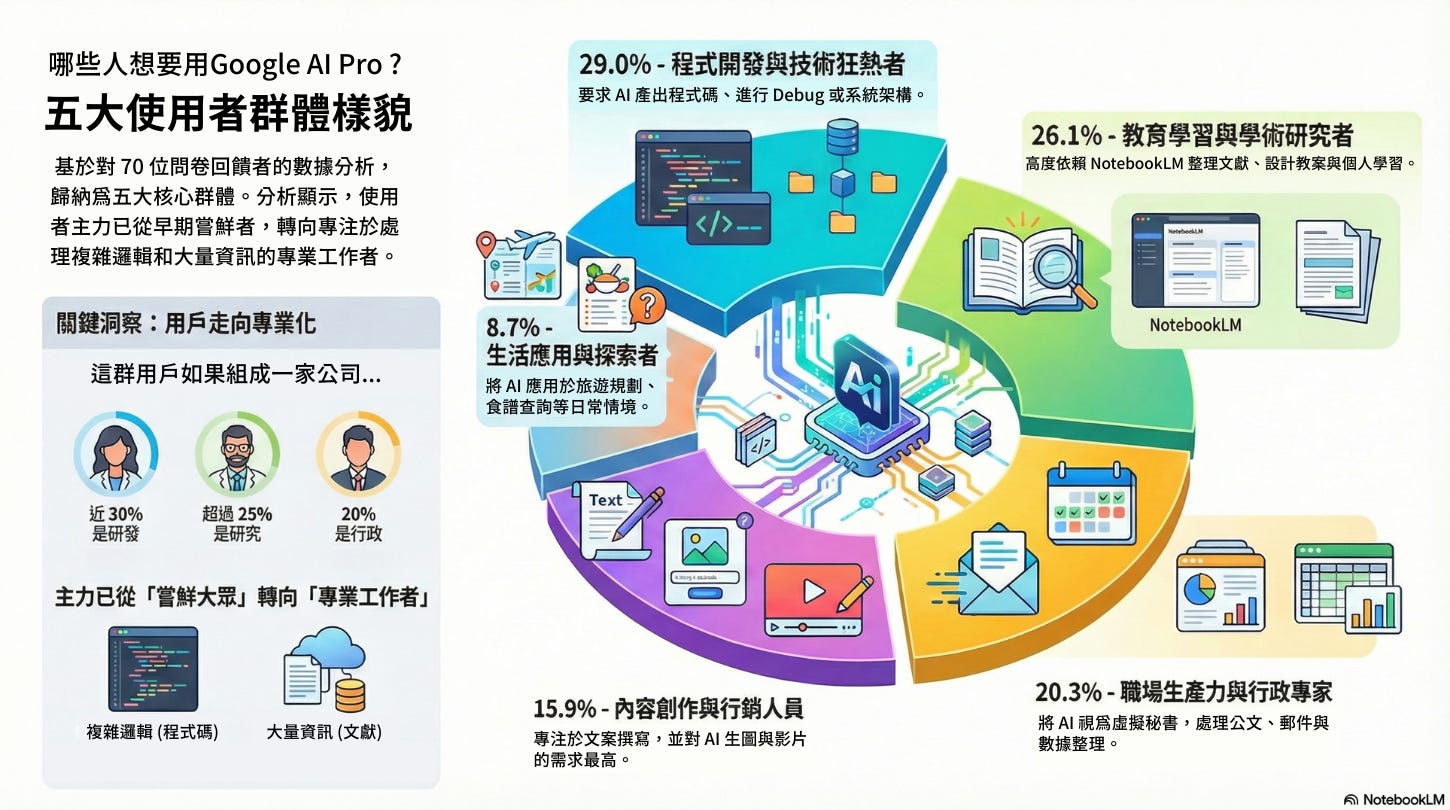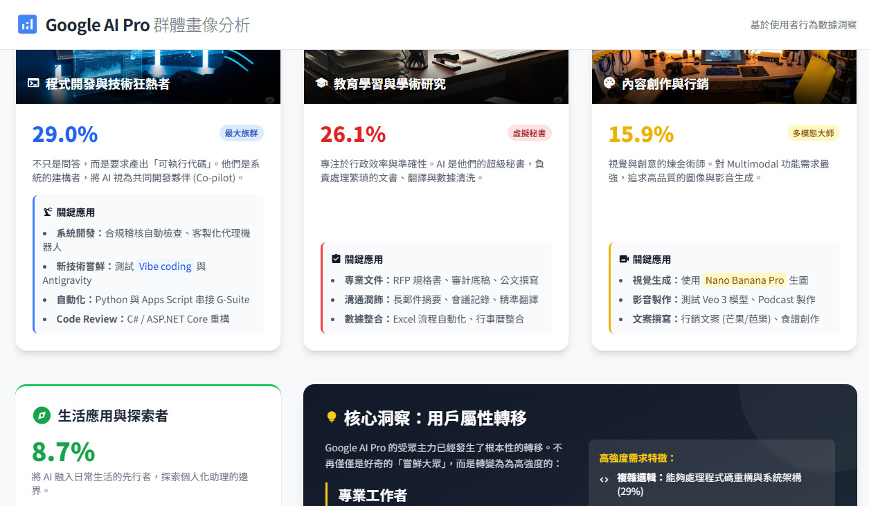 此族群技術程度高,廣泛使用 AI 協助 Python、Debug、專案開發與 Apps Script 自動化。他們對 Pro 版的期待是能真正落實 Vibe coding:以自然語言共同建構完整系統(如合規檢查、客製代理、Code Review),而非只輸出片段程式碼,讓 AI 成為技術夥伴。