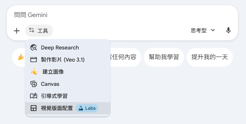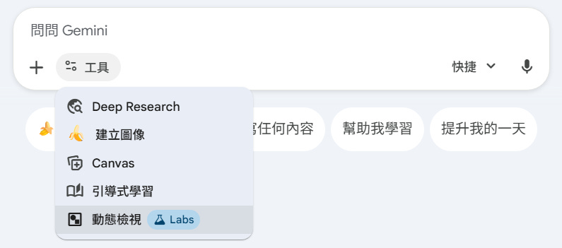Gemini 最近推出兩個新功能:「動態檢視」(Dynamic View) 與「視覺版面配置」(Visual Layout)。不再只給你純文字回覆,而是能根據使用者的指令,即時生成更華麗麗的版面。而這兩個功能是隨機出現的,讀者可以看看自己網頁上的 Gemini 被分配到哪一個喔。