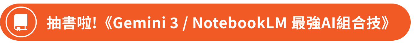 這次將抽出兩位幸運得主,獲得《零花費上手!Gemini 3 / NotebookLM / Nano Banana Pro / Veo 3.x 最強 AI 組合技,打造全能工作流》這本書。讀完這本書,你也能靈活運用 Google AI 的各種功能,幫你把瑣碎工作變聰明,效率翻倍!