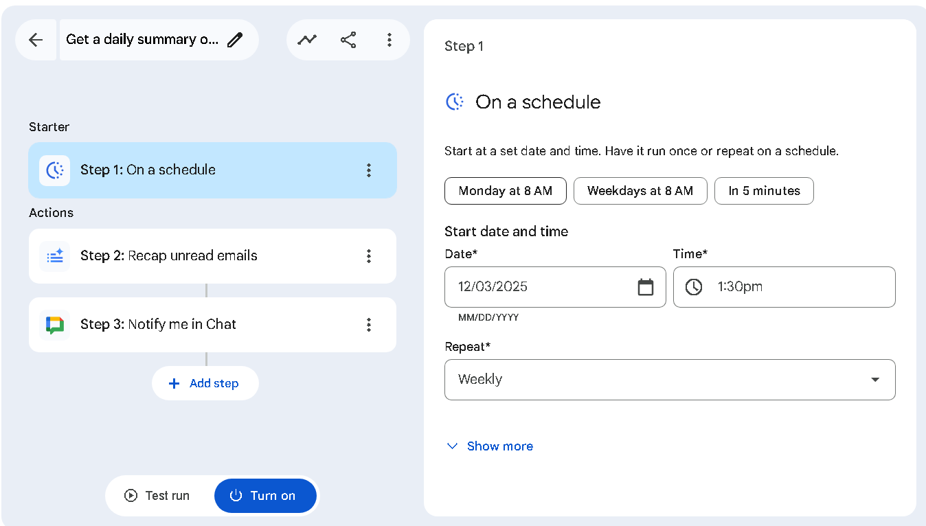 Workspace Studio 最聰明的地方在於它融入了日常的工作。這些 AI 代理可以直接嵌入 Gmail、Drive、Chat 等 google 推出的應用程式中,,完全不需切換工具。