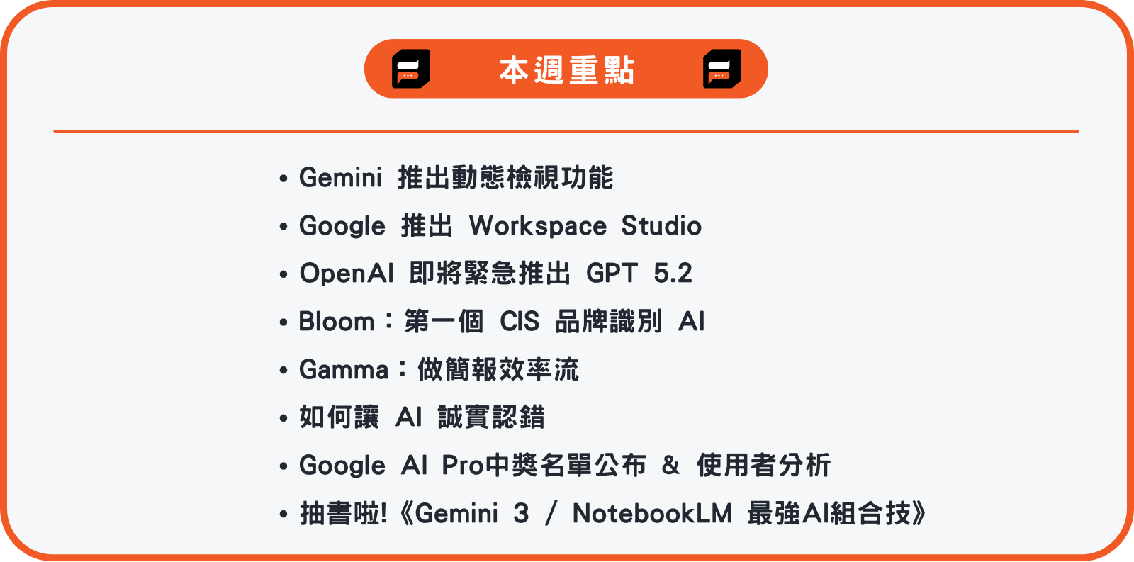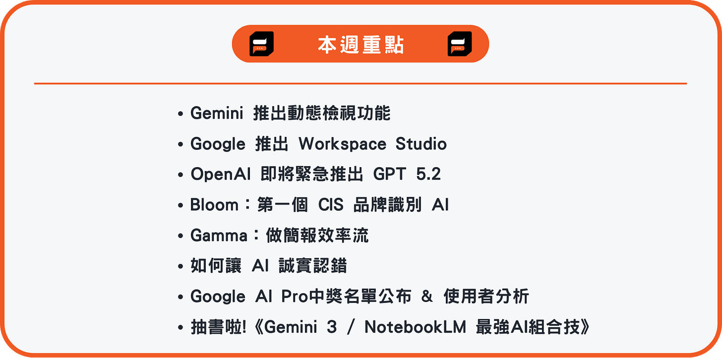 快訊:要抽書的朋友請滑到最後~ Gemini動態檢視功能、Google Workspace Studio、GPT 5.2快來了、Bloom CIS品牌識別、Gamma做簡報效率流、如何讓AI誠實認錯、Google AI Pro中獎名單公布&使用者分析