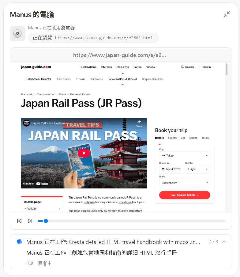 D 編有實際使用 Manus 嘗試完成一些任務,例如:將某 YT 線上系列課程轉成文字教材,大致的操作過程可自行參見 Medium 文章。Manus 的做法是在一個虛擬電腦環境中去幫使用者執行各種任務,根據目前實測的結果,只要是用程式解決的工作,通常 Manus 可以應付自如,遇到網頁端可能會有比較多狀況,特別是操作比較複雜的介面,可能需要人為手動接管,才能執行下去。另外,你跟 Manus 互動的過程,也可以儲存在個人的「知識庫」,下次遇到類似狀況,它就會知道怎麼做。