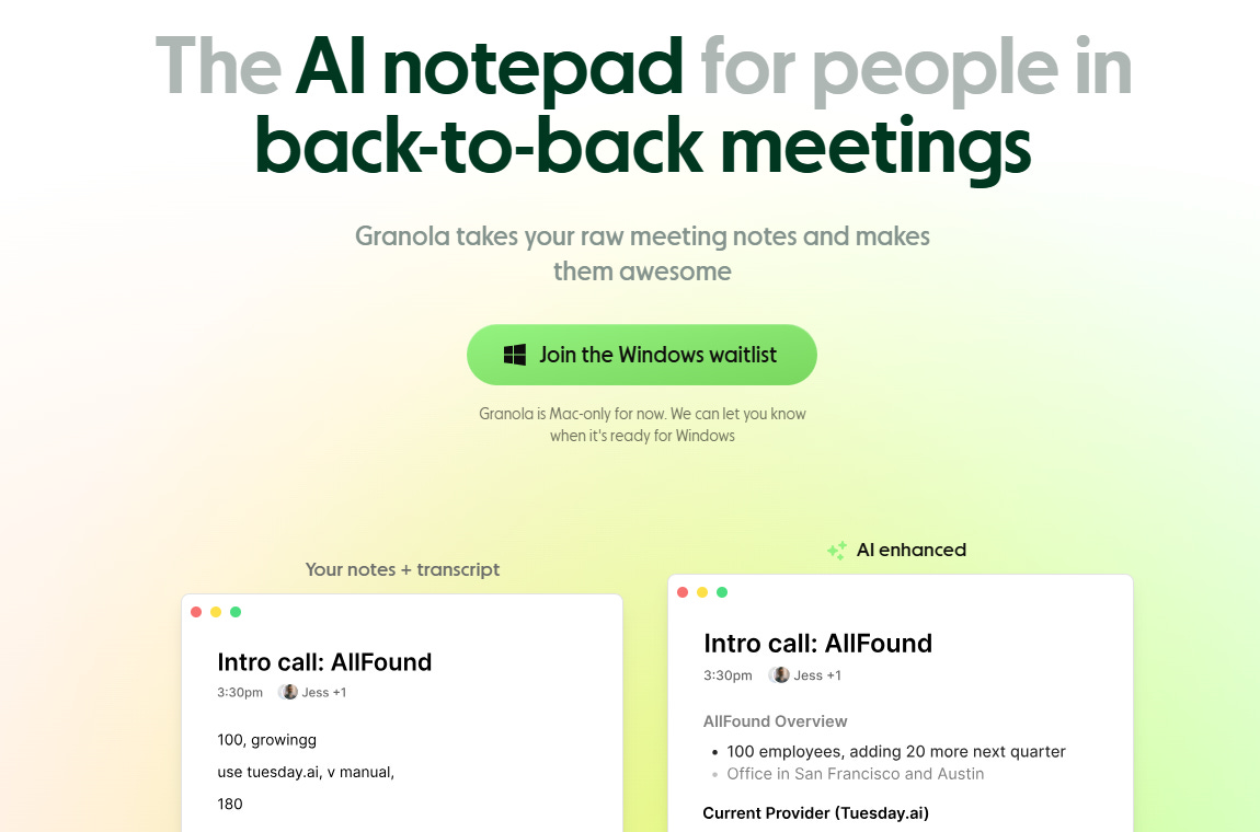 雖然名為 Granola,但是在這裡可不是指麥片,而是一款專為會議打造的 AI 筆記工具,它看起來就像一般筆記本,但會「聽」你的會議,然後根據你寫下的重點和對話內容,自動幫你整理出清晰、實用的會議筆記。