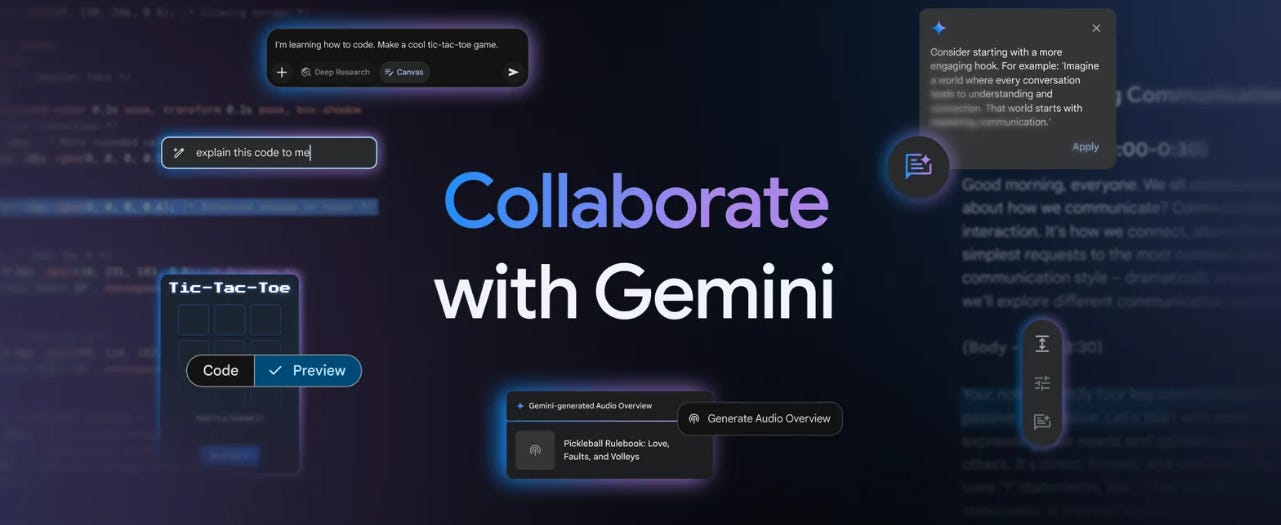 類似白板的互動空間,可以和 Gemini 一起在畫布上寫下想法、拖拉元件、整理筆記。適合用來規劃專案、創作、腦力激盪。