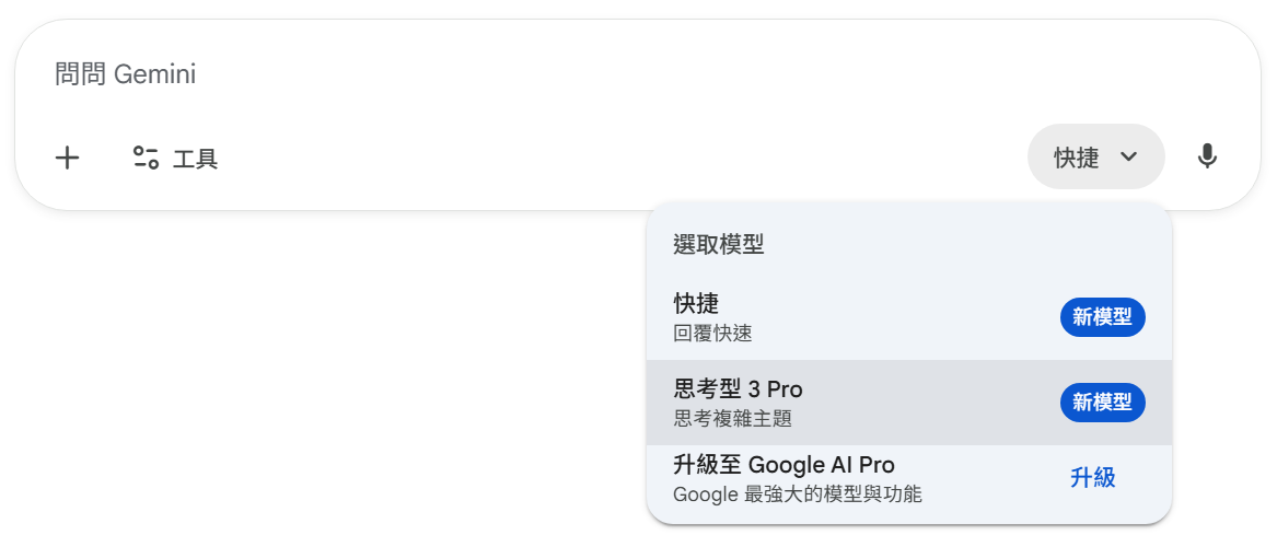 方法一、從 Google Gemini 網頁版,在對話框右下角切成「思考型 3 Pro」