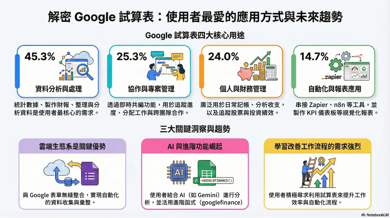 有顯著比例的使用者(約 14.7%)提及使用 Make、n8n、Zapier 或 Power Automate 等工具來進行自動化流程串接。更值得注意的是,多位使用者明確提到結合 AI (如 NotebookLM 或 Gemini) 來整理、分析數據、生成圖表、或利用 AI 協助生成程式碼(如 VBA)。還有使用者利用內建的 googlefinance 函式來自動更新股票數據,顯示對進階功能的重視。