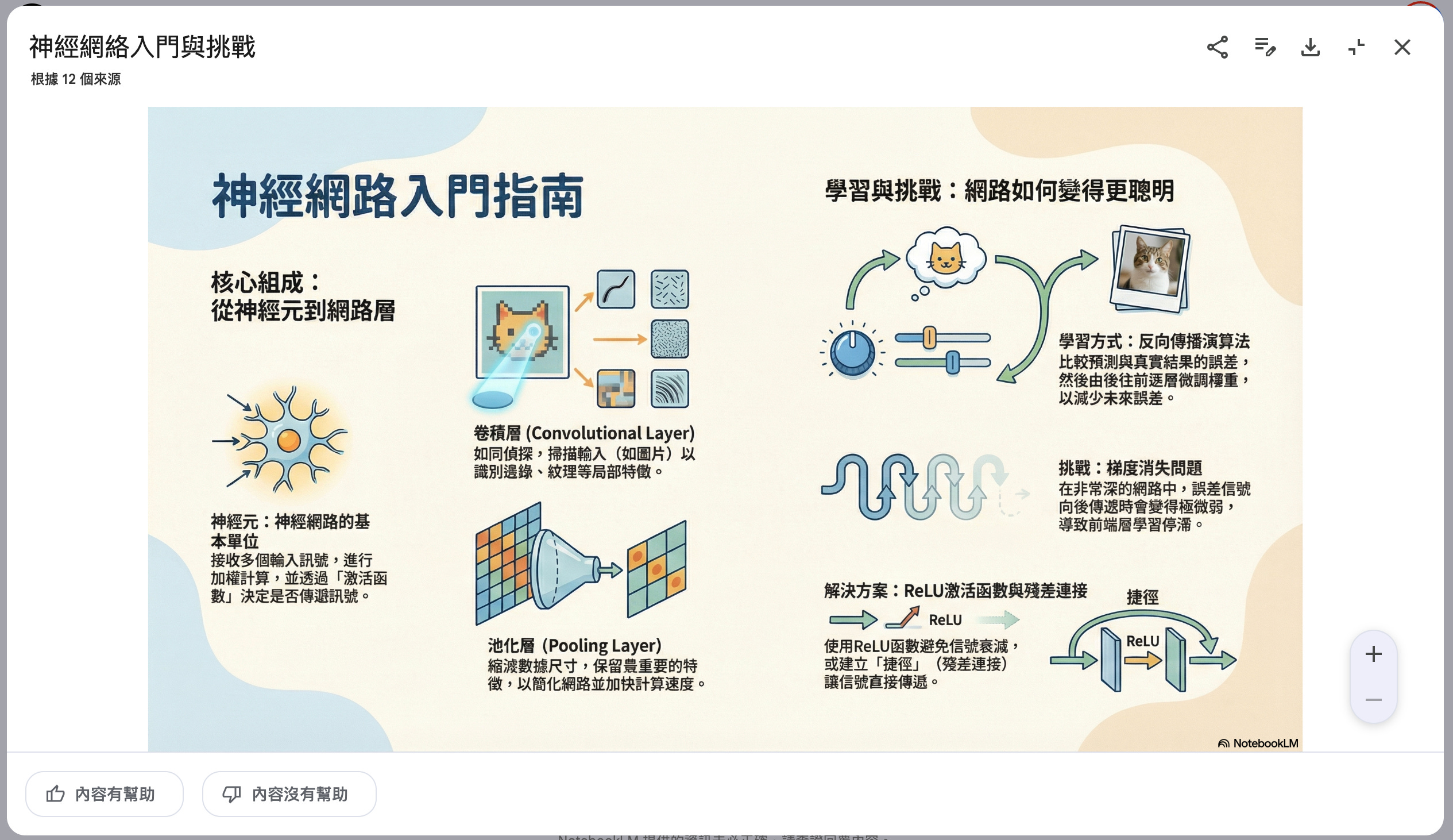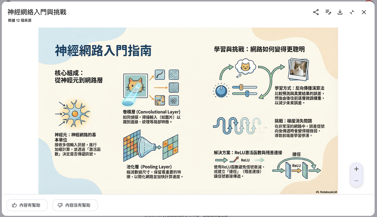 NotebookLM的一大優勢是,它會嚴格遵循使用者上傳的原始文件內容來生成簡報和視覺圖表,這樣一來,能有效減少其他 AI 工具常出現的「幻覺」問題,讓使用者幾乎不必再花時間編輯或進行事實查核。 而這些專業級的視覺效果,全都仰賴Google最新推出的Gemini 3 Pro Image模型(也被稱為Nano Banana Pro)。這個模型能處理複雜的圖解,不僅產圖品質高,連在繁體中文的文字輸出上,清晰度也大幅提升,解決 AI 圖像中常見的文字模糊問題。讓你從此告別熬夜做圖的痛苦。對於想要快速消化大量資訊或進行資料研究的人來說絕對值得一試!